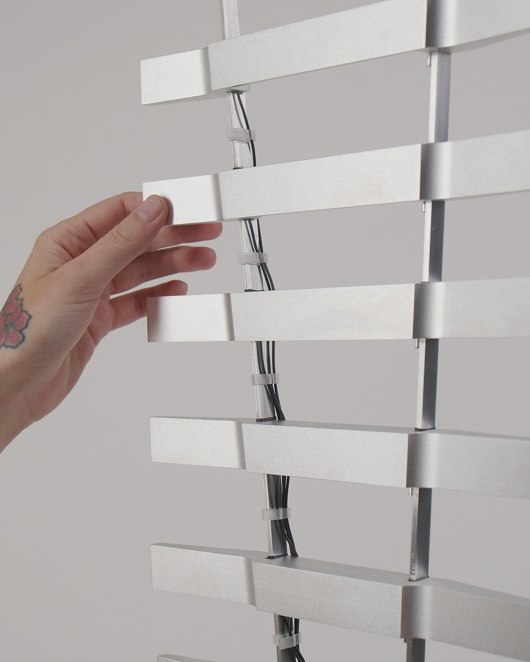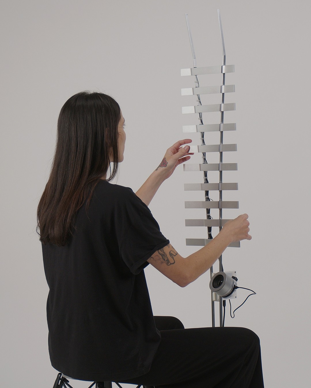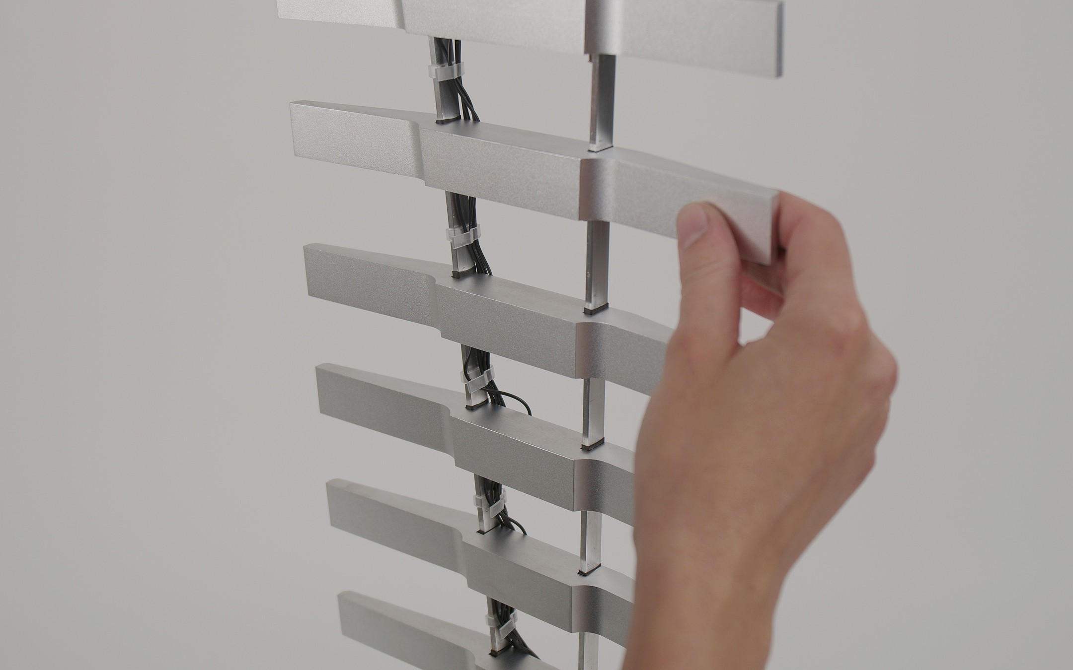 Visually, VS.WAV reads like a waveform rendered in steel—a kinetic skyline of upright fins, cabled like an open circuit diagram. The form suggests repetition and rhythm, but also something more organic: the vertebrae of a mechanical spine, the stem of a futuristic plant, a sonic antenna rooted in sculptural soil. Shahar draws inspiration from musical instruments, biological structures, and the logic of architecture—all compressed into a singular, stand-alone entity.